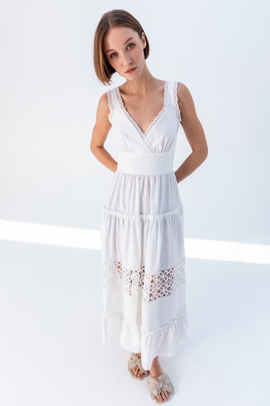 Askılı Fisto Detaylı Midi Boy Beyaz Elbise