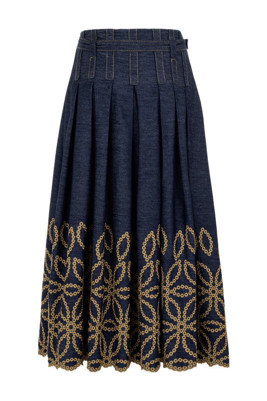 Brodeli Pileli Denim Midi Etek