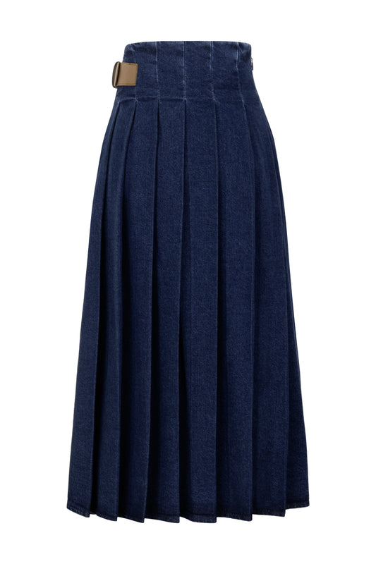 Kemer Detaylı Pileli Lacivert Denim Etek