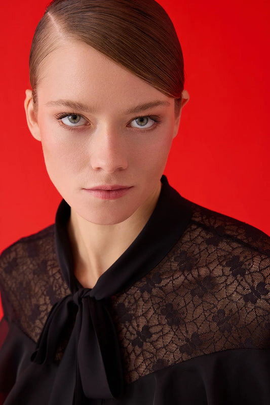 Si̇yah Şal Yaka Dantel Ve Volan Detaylı Bluz