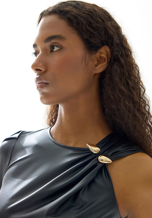 Gold Aksesuarlı Tek Kol Deri Bluz
