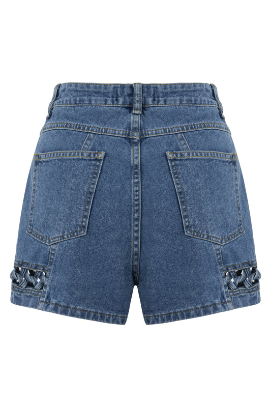 Örgü Detaylı Mavi Denim Şort
