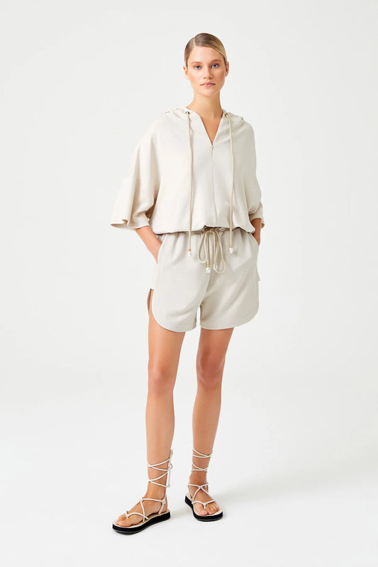 Bej Kapüşonlu Bağcıklı Bluz Şort Takım