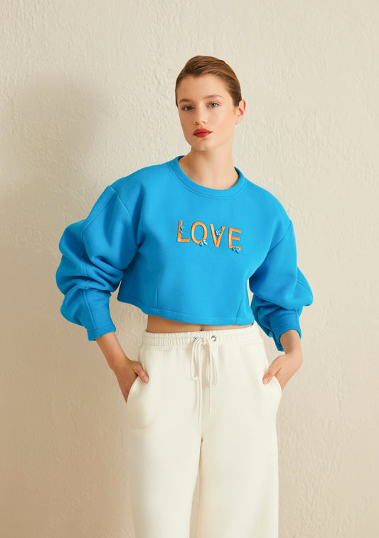 Boncuk İşleme Detaylı İnce Askı Mavi Crop Top