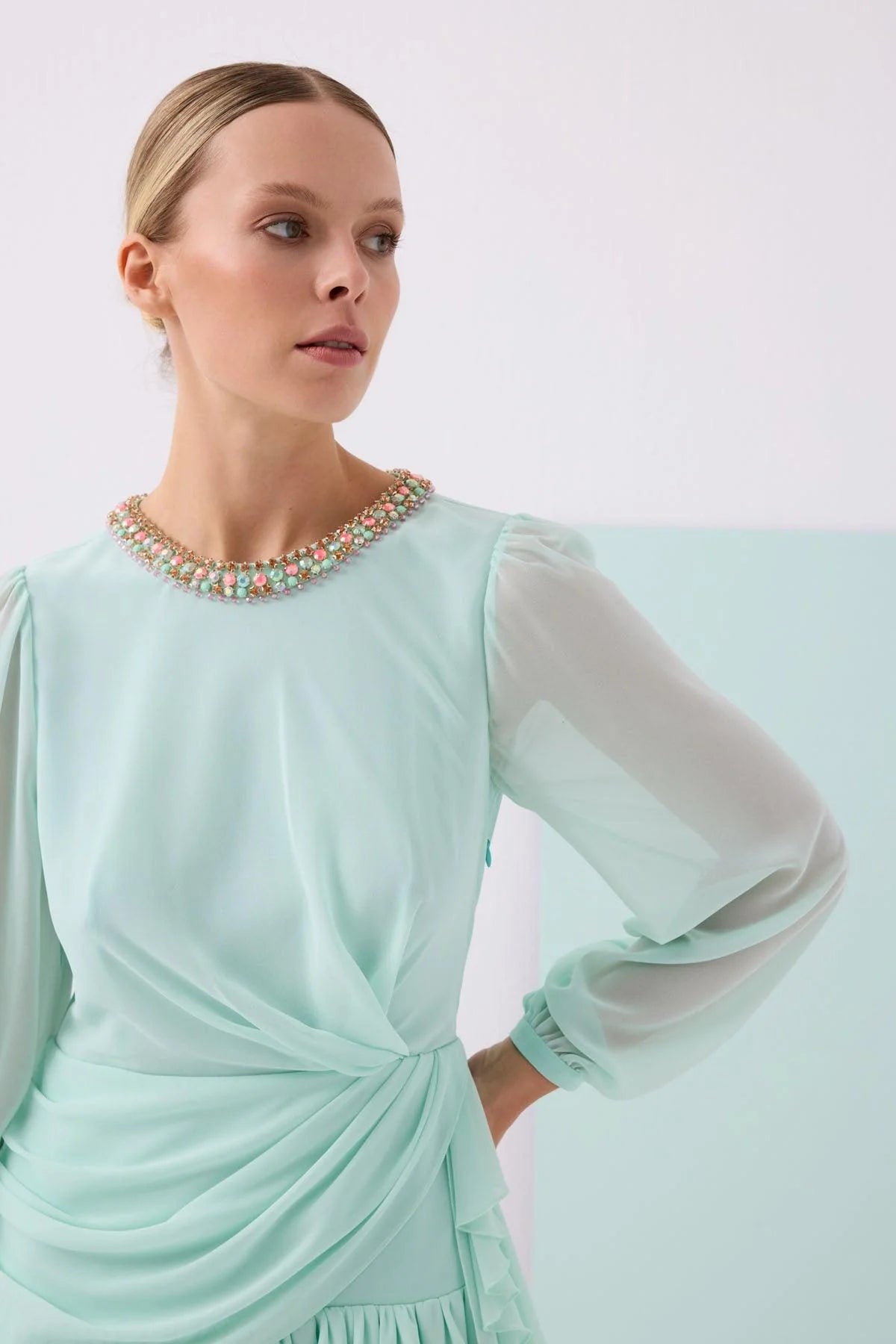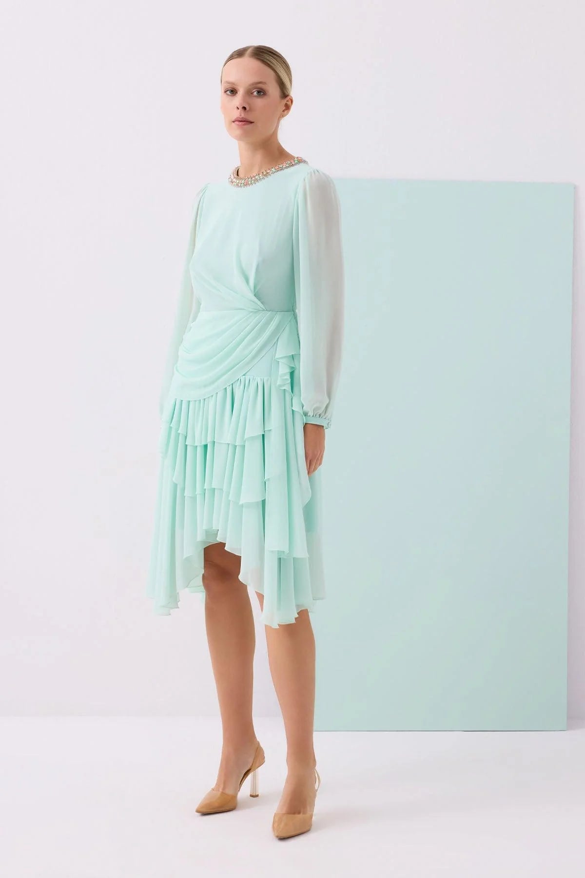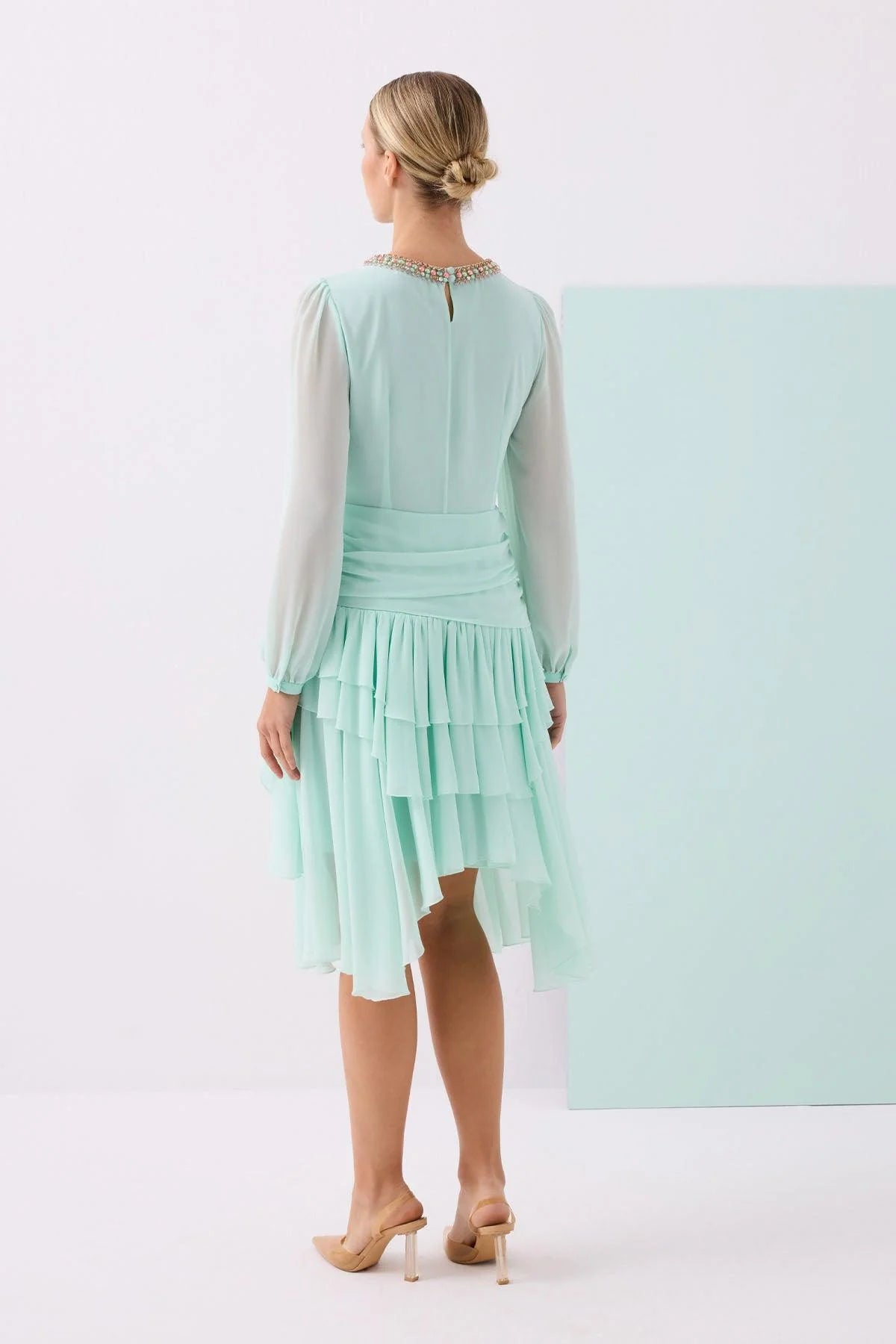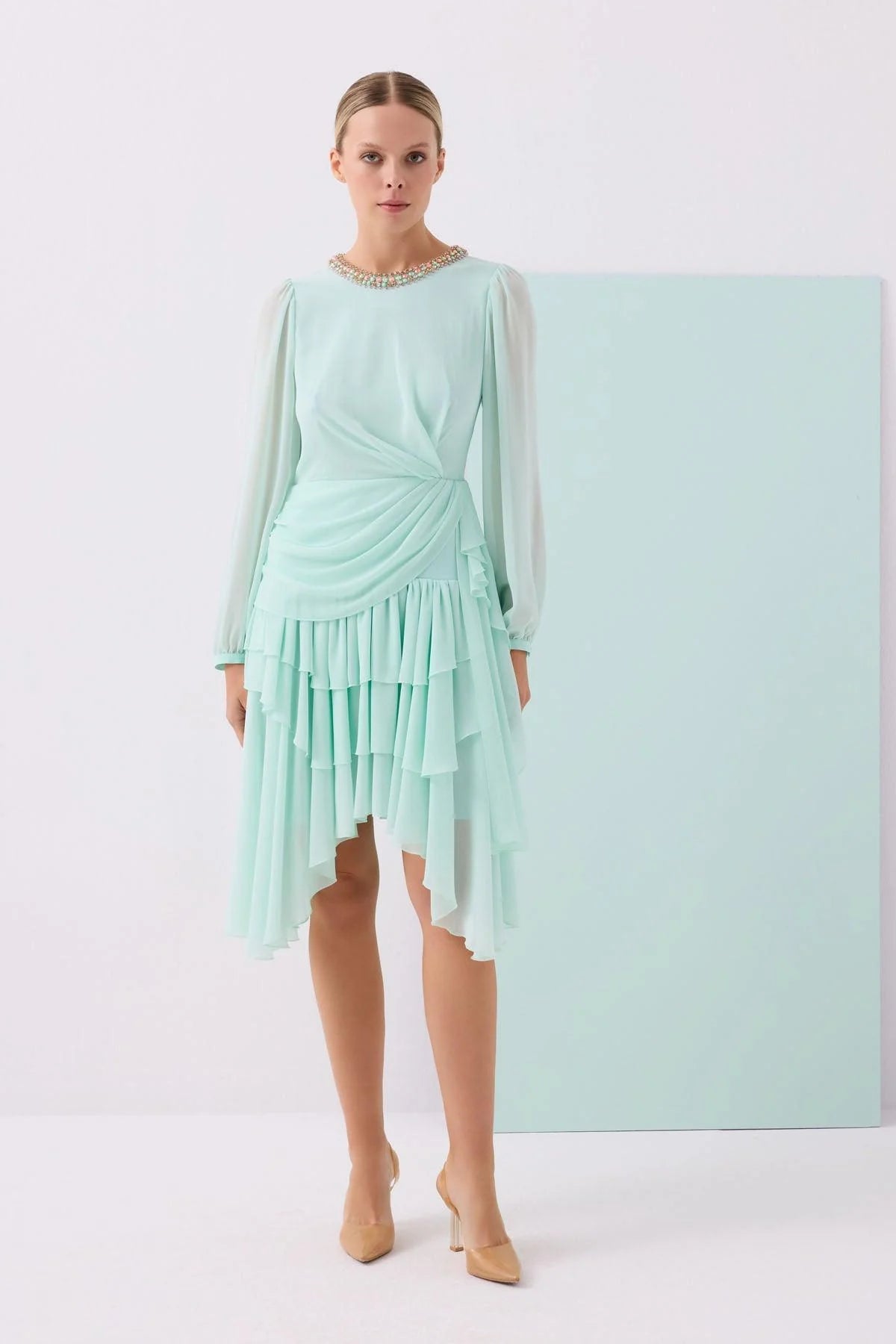 Bisiklet yakalı, gizli fermuar kapamalı, yakası taş işlemeli transparan uzun kollu, asimetrik kesimli, astarlı, eteği kat kat, dokuma kumaştan mint elbise.